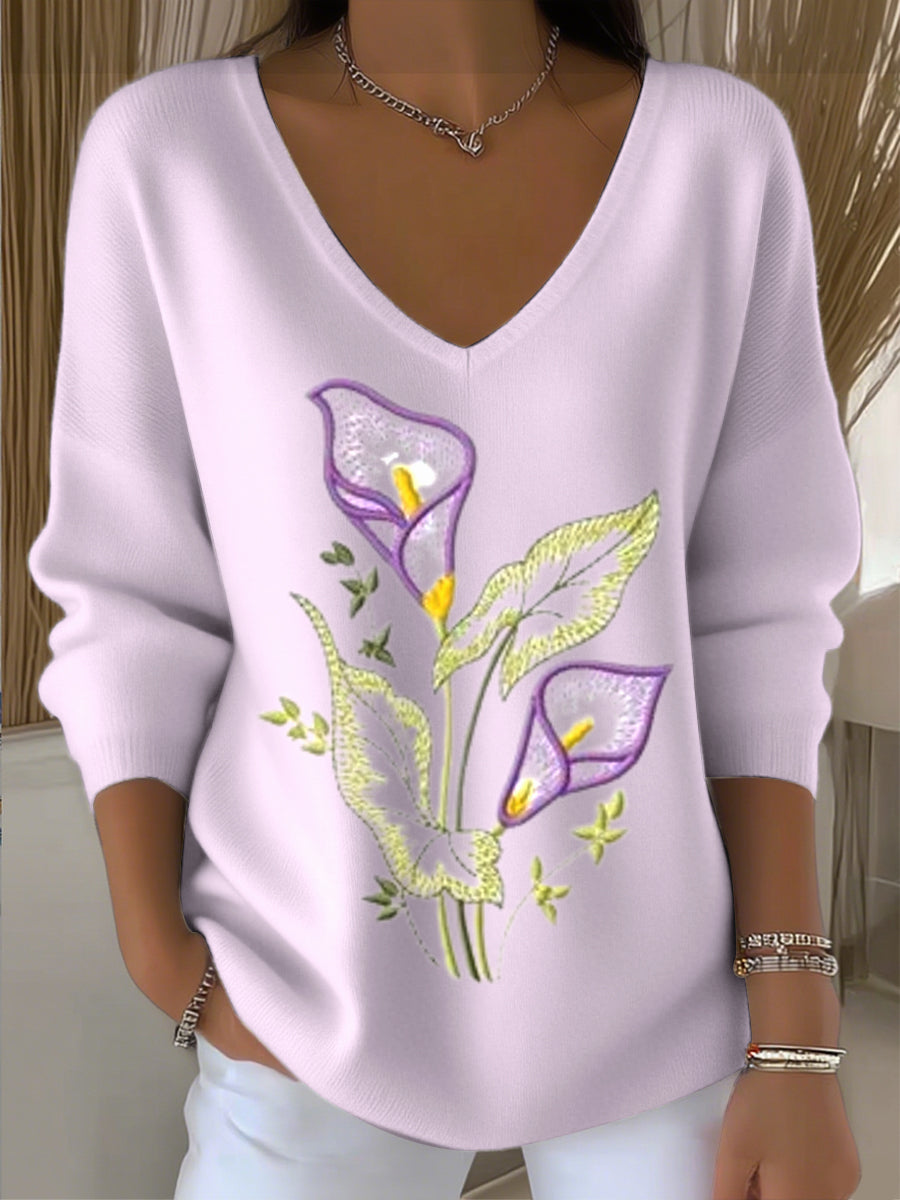 Γυναικείο απλό και όμορφο πέταλος κεντήριο ανοικτό μωβ λαιμό V-τρεχεσμένο κεντήριο πουλόβερ λουλούδι κέντημα λουλουδιών