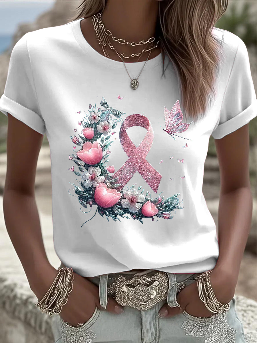 Γυναικείο καρκίνο του μαστού κορδέλα πεταλούδα λουλούδια εκτύπωση Casual T-shirt
