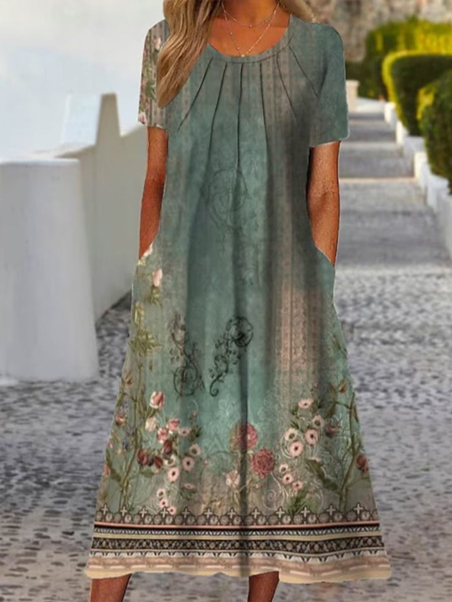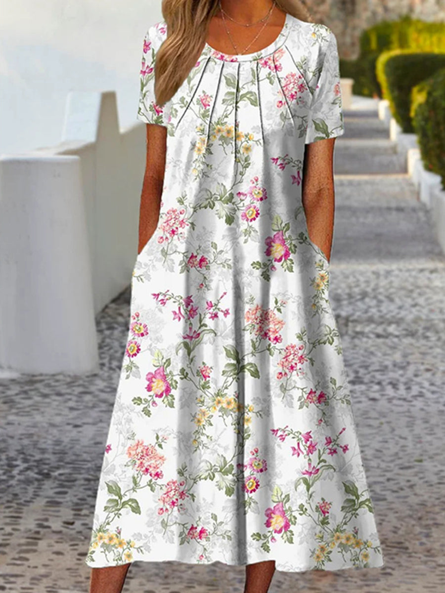 Γυναικείο περιττό λουλούδι εκτύπωση κοντό μανίκι Midi φόρεμα τσέπη