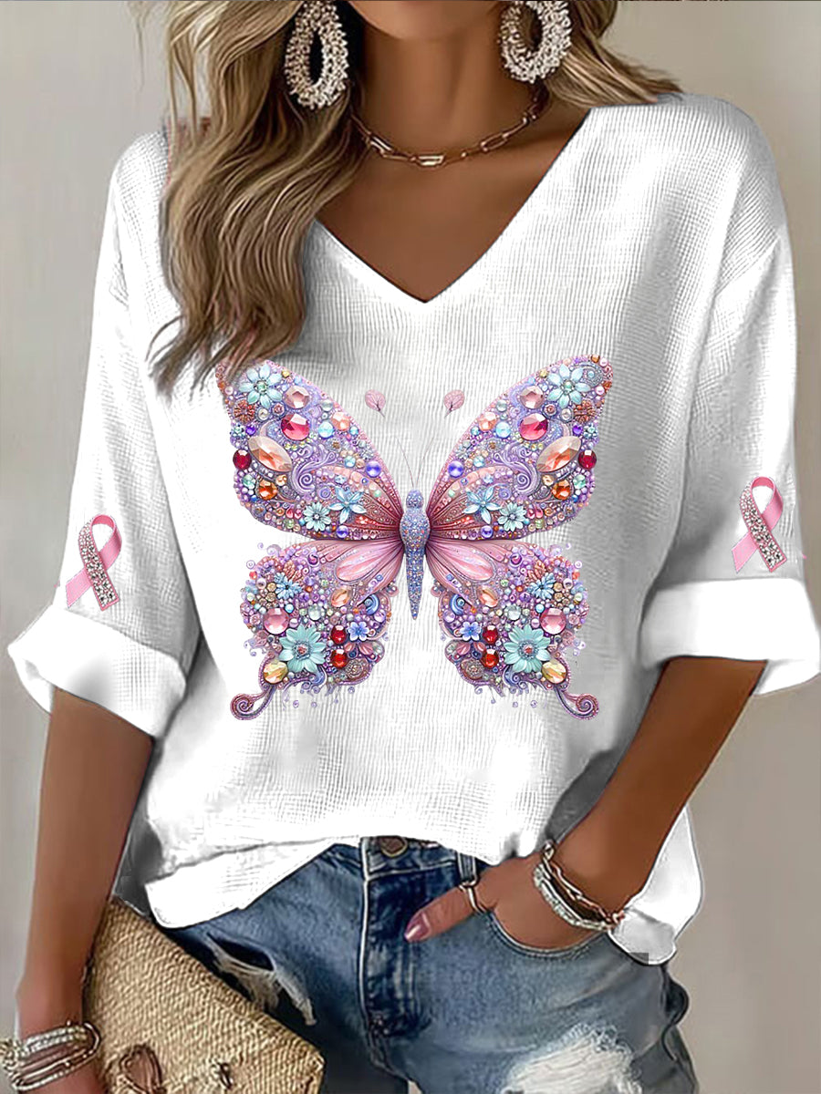 Γυναικείο ροζ πεταλούδα τόξο περιστασιακό V-Neck κορυφαίο