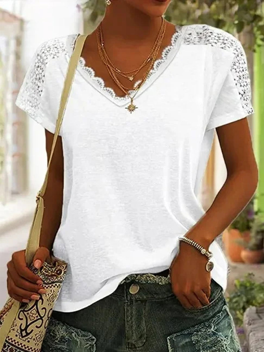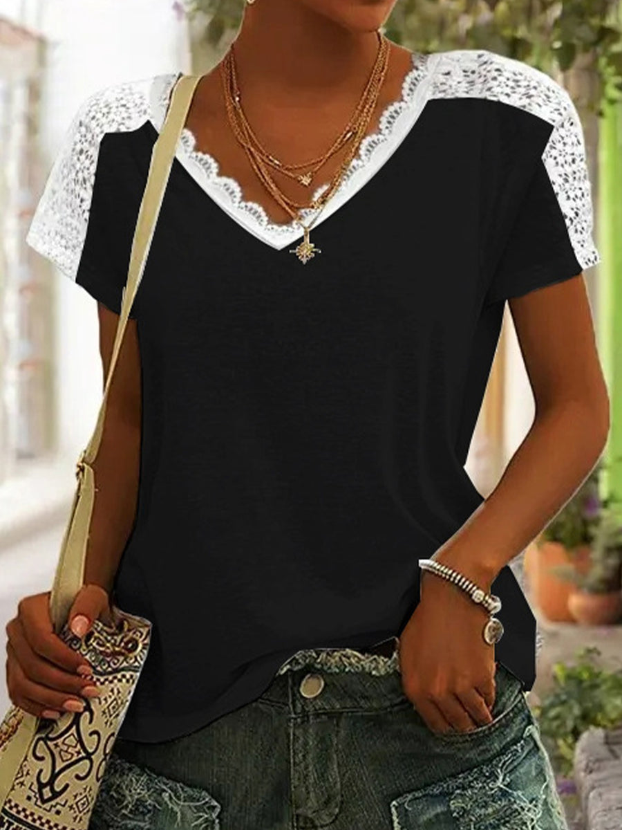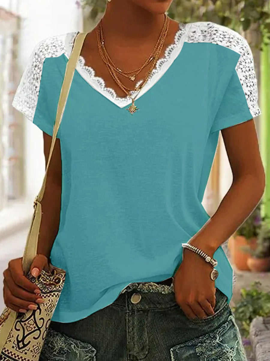 Γυναικείο casual V-λαιμόχρεο δαντέλα ραφή μασίφ χρώμα κοντομάνικο κορυφαίο T-shirt