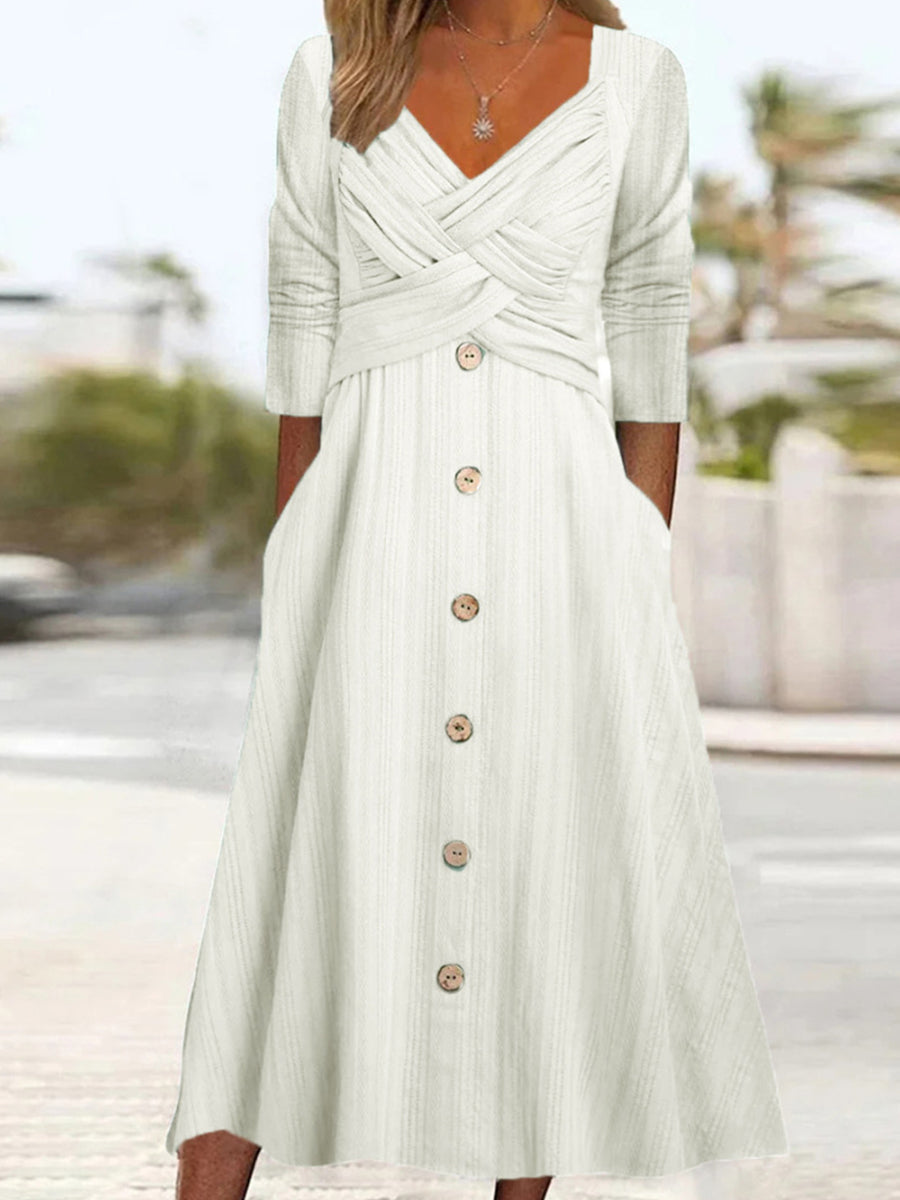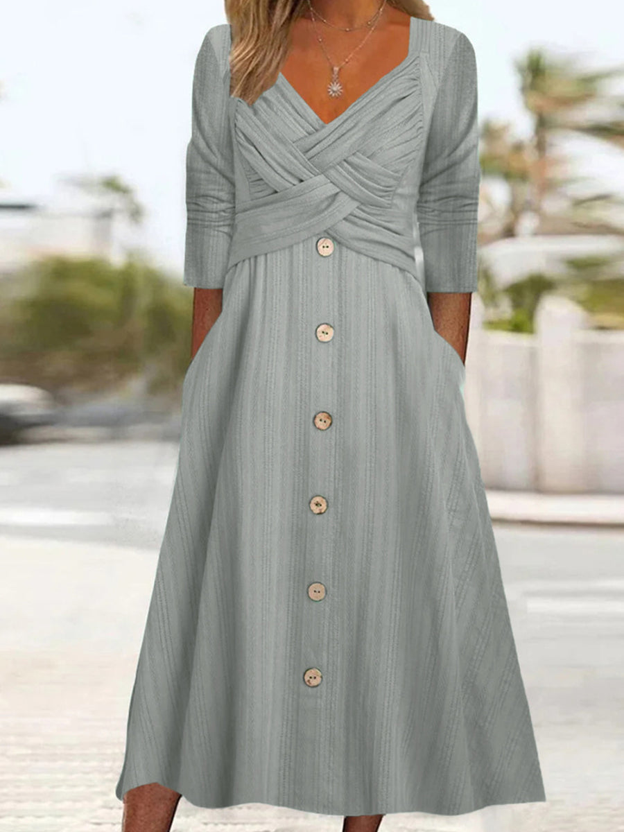 Γυναικείο Retro στερεό χρώμα V-Neck σταυρό κουμπί Midi φόρεμας