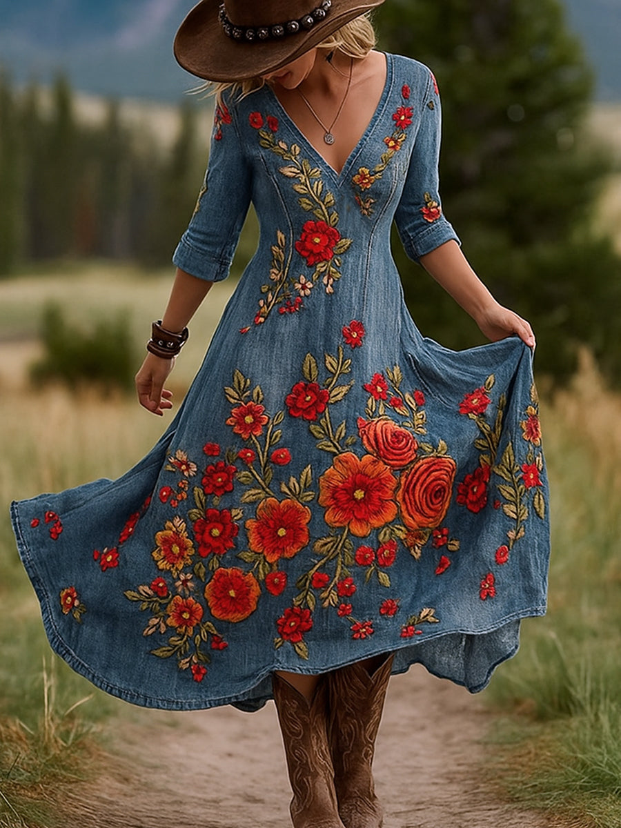 Εκτύπωση Vintage V-λαιμό μακρυμάνικο βαμβάκι Maxi φόρεμα βαμβάκι