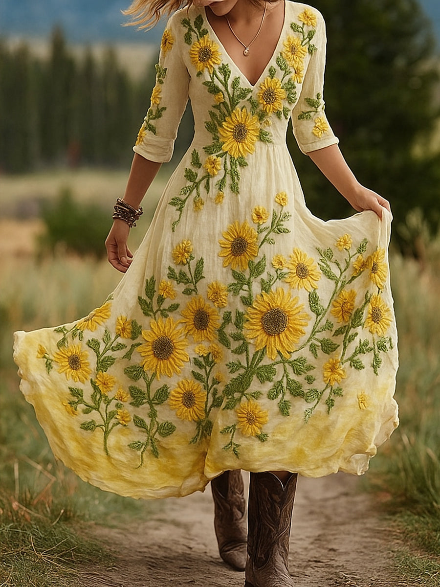 Εκτύπωση Vintage V-λαιμό μακρυμάνικο βαμβάκι Maxi φόρεμα βαμβάκι