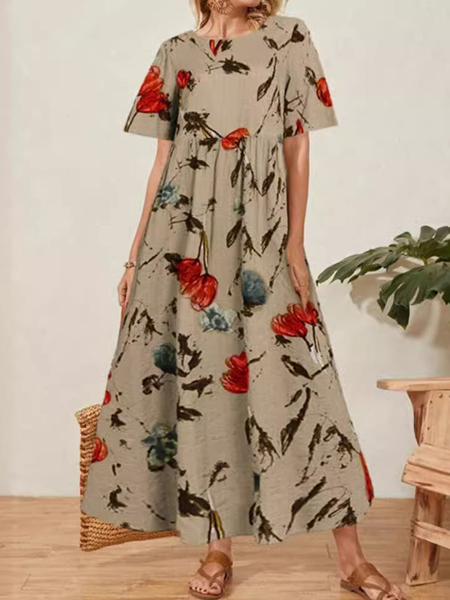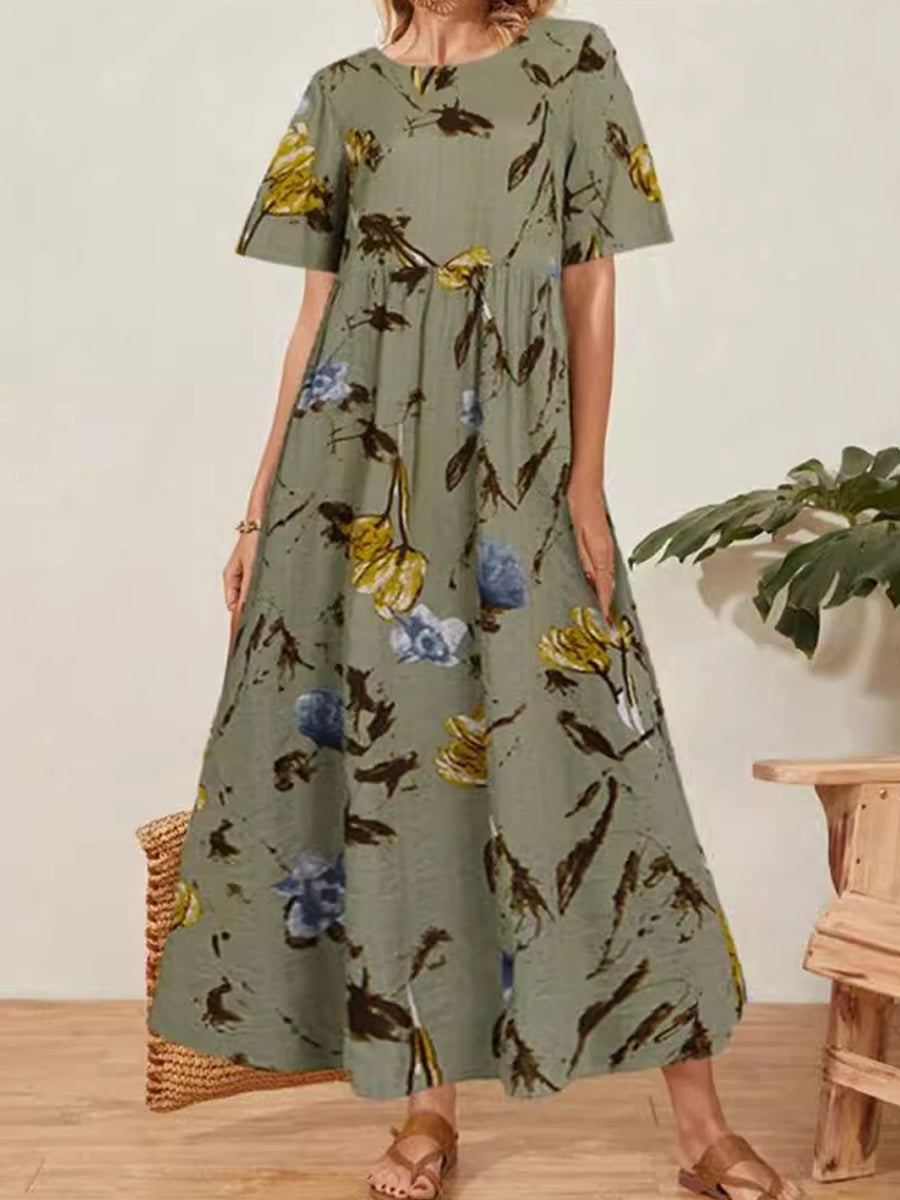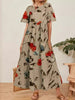Γυναικείο Retro ανθοπωλεία τέχνη εκτύπωση στρογγυλό λαιμό κοντό μανίκι μακρύ φόρεμα