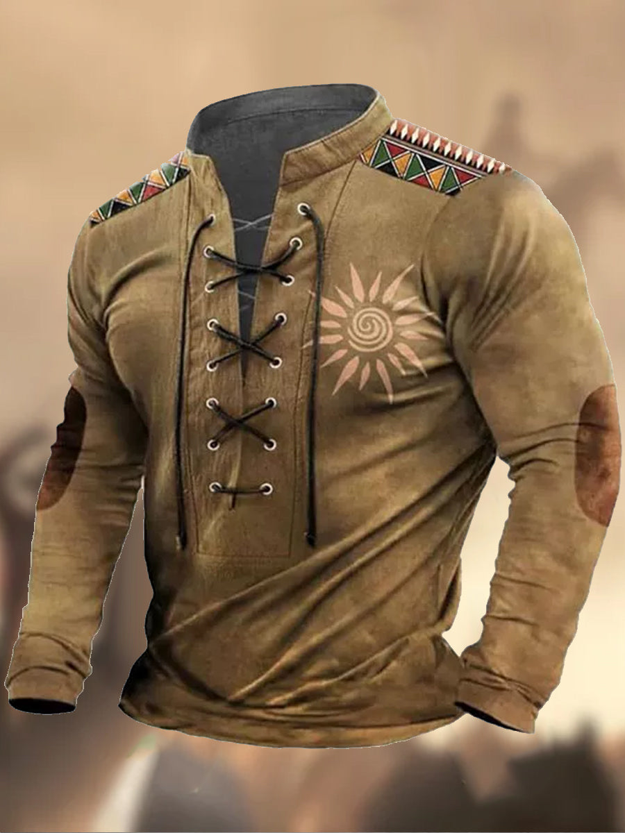 Retro Western Highway υφή μοτίβο τυπωμένο χωριό V-Neck Henry στυλ μακριά μανίκι πουκάμισα