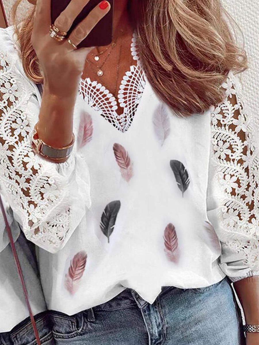 Γυναικείο περιστατικό V-Neck δαντέλα φτερό εκτύπωση patchwork μακρυμάνικο πουκάμισο κορυφαίο
