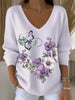 Γυναικείο ιδιοσυγκρασία μωβ λουλούδια πεταλούδα κέντημα V-λαιμό πουλόβερ.