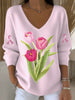 Γυναικεία τουλίπα κεντημένη ροζ V-λαιμό πουλόβερ